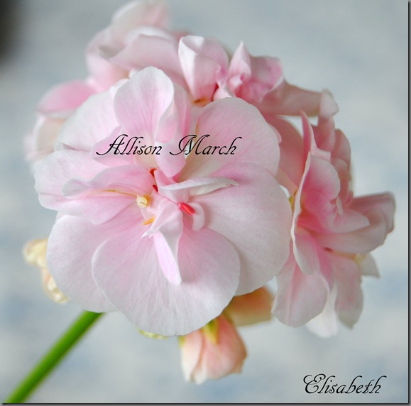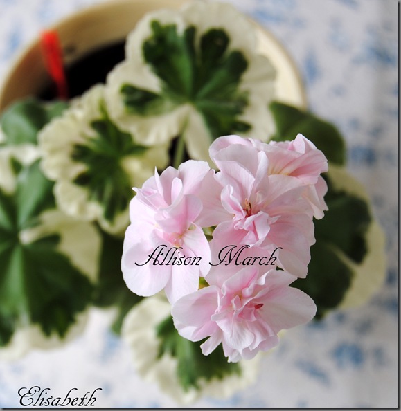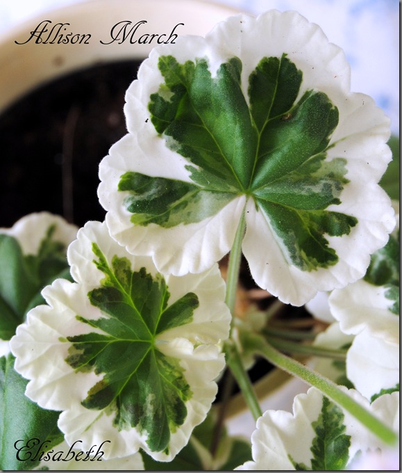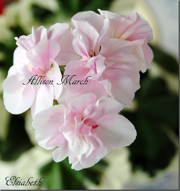 Allison March er en vakker pelargon med lyserosa/hvite doble blomster. Bladverket er i creme og olivengrønt. Planten er en tett og fin vekstmåte og blir ikke veldig høy.