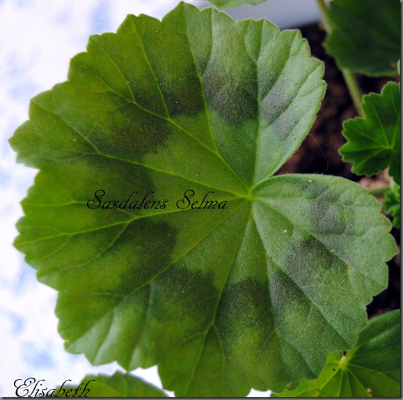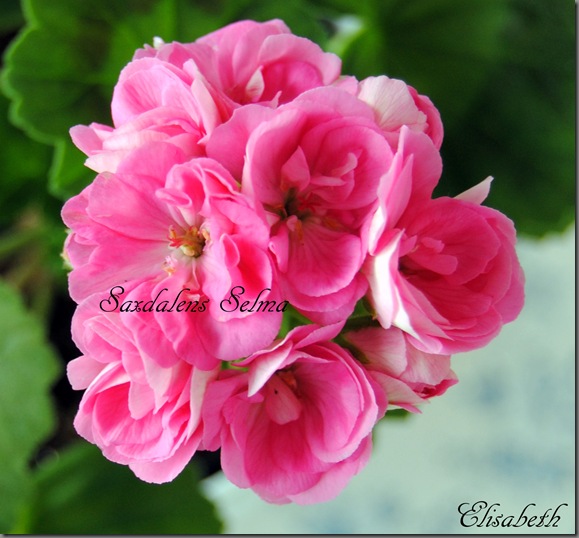 Saxdalens Selma er en vakker zonalepelargonium. Planten får faste, doble blomster i rosa med litt hvitt mot øye.  Planten har et kraftig bladverk og bladene har en lysere medaljon i midten på hvert blad og tydelig sonemarkelig.